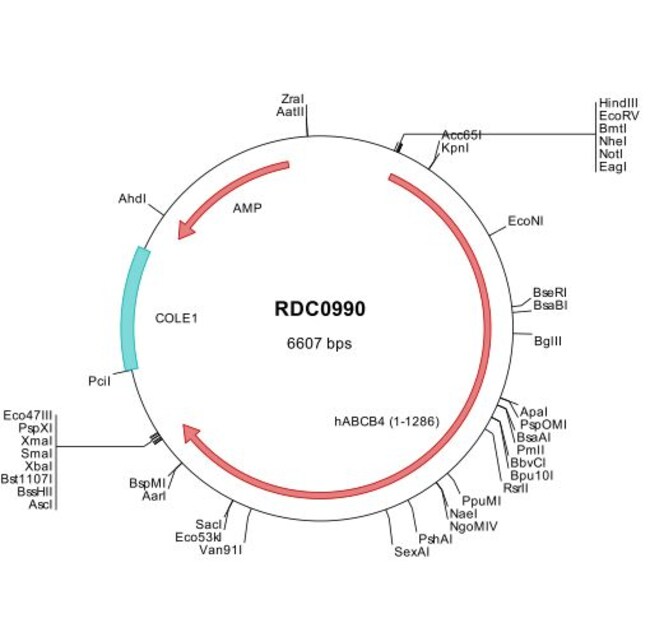 The Human MDR3/ABCB4 (NP_061337) VersaClone cDNA clone contains the complete ORF for MDR3/ABCB4, along with a Kozak consensus sequence for optimal translation initiation. The gene insert is flanked with convenient multiple cloning sites which can be used to easily cut and transfer the gene cassette into your desired expression vector. The MDR3/ABCB4 insert is sequence verified and the entire plasmid DNA and insert translated sequences are provided.